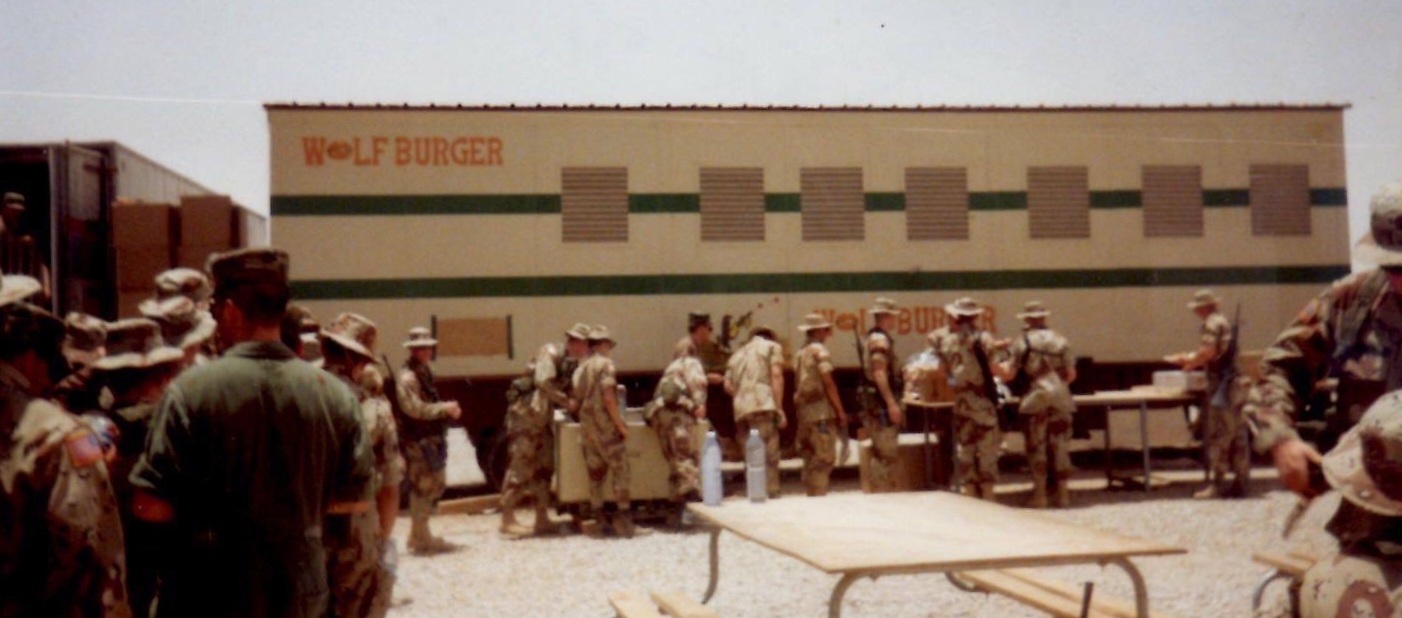 "Pagonis established contact with Zahir Masri, a wealthy Saudi businessman, who with Chief Warrant Officer 4 Wesley Wolfe, Pagonis’ food czar, arranged to supply troops with hot meals (lasagna, hot dogs, pizza, etc.) and fresh pita bread, fruit and vegetables, even to soldiers at the front lines, a remarkable morale-booster. By December up to 300,000 U.S. troops were eating these so-called “A-rations” each day, plus “Wolfburgers” – hot hamburgers supplied by several mobile vans Wolfe sent to desert posts."